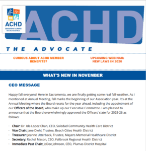 The Association of California Healthcare Districts (ACHD) represents Healthcare Districts throughout California. ACHD works with numerous state and local entities to promote the profound role healthcare districts play in responding to the specialized health needs of tens of millions of Californians while also having direct accountability to the communities that districts serve.